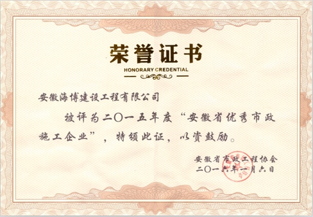 合肥市市政工程協(xié)會第三屆三次理事大會于昨日召開,會上對2015年度評選出的合肥市市政工程“優(yōu)秀企業(yè)”和“優(yōu)秀項目經理”進行表彰,海博建設股份有限公司榜上有名,并且我司李申鋒、郭劍兩位同志也榮獲...