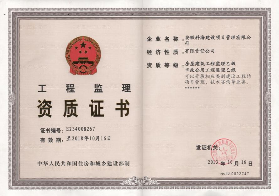2013年10月16日,安徽科海建設項目管理有限公司成功晉升建筑、市政監(jiān)理乙級資質,在此向科海公司表示熱烈祝賀!...