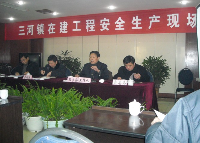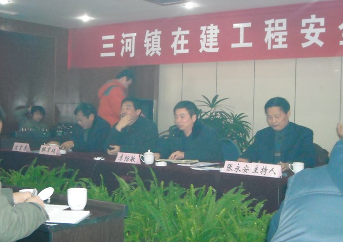 三河鎮(zhèn)在建工程安全生產(chǎn)現(xiàn)場會于2009年12月19日09時在三河國際大酒店隆重召開,肥西縣建設(shè)局黨組書記張永安同志參加并主持會議,參加會議的領(lǐng)導(dǎo)還有肥西縣建設(shè)局局長李紹敏,副局長解軍培,副局長戴忠德等。
