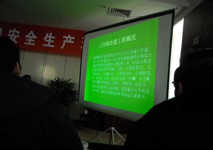 黨組書記張永安同志首先就肥西縣建設(shè)局發(fā)布的 “建設(shè)[2009]151號,建設(shè)[2009]154號,建設(shè)[2009]155號”文件中的工作進(jìn)行安排。接著解軍培同志講述了“百日會戰(zhàn)”開展情況,并就安全檢查中存在的隱患以幻燈片的形式展示給參會企業(yè),讓企業(yè)領(lǐng)導(dǎo)體會在建項目安全隱患的嚴(yán)重性以及安全隱患處理的緊迫性。李紹敏同志就施工報建、安全生產(chǎn)、農(nóng)民工工資等問題提出存在的問題及整改要求,重點對施工用電、臨邊防護(hù)、腳手架搭設(shè)及地面硬化、施工機(jī)具現(xiàn)場防護(hù)及現(xiàn)場施工人員的安全意識等方面存在的問題進(jìn)行批評和教育,要求企業(yè)領(lǐng)導(dǎo)一定要在安全生產(chǎn)過程中起帶頭作用,深入項目施工現(xiàn)場,親自把關(guān),把整改措施落實到位。