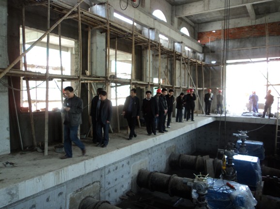 檢查組一行認真查看了施工現(xiàn)場,對泵站主體、進水池、出水池、機電設(shè)備安裝等進行了細致檢查,并向施工人員詳細詢問了泵站建設(shè)階段的相關(guān)技術(shù)問題。隨后又對我公司施工資料進行了檢查。