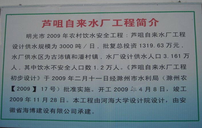 明光市蘆咀自來水廠工程是明光市2009年農(nóng)村飲水安全項(xiàng)目的一部分,我公司克服地理位置偏僻、資金短缺、施工難度大等許多困難,精心組織施工力量,積極協(xié)調(diào)施工環(huán)境,安全生產(chǎn),文明施工,最終按進(jìn)度保質(zhì)保量圓滿完成了施工任務(wù)。