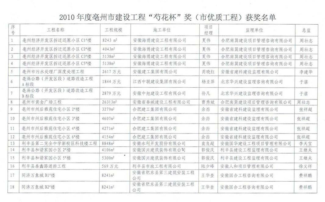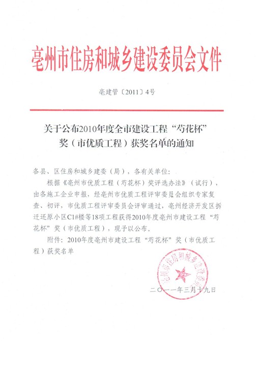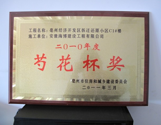 熱烈祝賀由安徽海博建設(shè)工程有限公司亳州項目部承建的亳州經(jīng)濟開發(fā)區(qū)拆遷還原小區(qū)C1#、C2#、C3#、C5#號樓四個單位工程榮獲2010年度亳州市優(yōu)質(zhì)工程“芍花杯”獎。