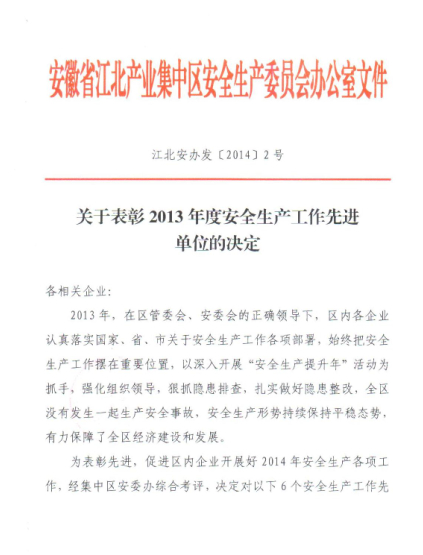 4月2日,安徽省江北產(chǎn)業(yè)集中區(qū)召開2014年第一次安全生產(chǎn)會(huì)議,我公司市政道路四期項(xiàng)目部在安全生產(chǎn)工作中表現(xiàn)突出,被集中區(qū)管委會(huì)、安委會(huì)授予“2013年度安全生產(chǎn)工作先進(jìn)單位”榮譽(yù)稱號(hào)。