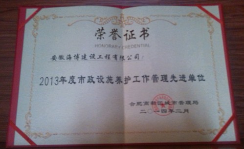 2014年4月,公司承攬的合肥市高新區(qū)市政養(yǎng)護工程,因表現(xiàn)優(yōu)異,被合肥市高新區(qū)城市管理局授予“2013年度市政設施養(yǎng)護工作管理先進單位”榮譽證書。