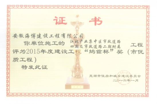 2016年2月2日,蕪湖市建筑業(yè)協(xié)會(huì)于市住建委大樓召開建筑業(yè)協(xié)會(huì)常務(wù)理事會(huì)暨工作交流會(huì);會(huì)上,蕪湖市建委向榮獲2015年“鳩茲杯”獎(jiǎng)的單位頒發(fā)了獲獎(jiǎng)證書及獎(jiǎng)杯,我單位承建的“江北產(chǎn)業(yè)集中區(qū)市政道路四期項(xiàng)目”喜獲該獎(jiǎng)。