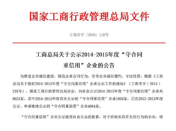 近日,國(guó)家工商行政管理總局向社會(huì)公布了2014-2015年國(guó)家級(jí)“守合同,重信用”企業(yè)名單,我公司以誠(chéng)信經(jīng)營(yíng)的理念和實(shí)際行動(dòng)再次獲得社會(huì)各界的認(rèn)可,榮獲了此殊榮。