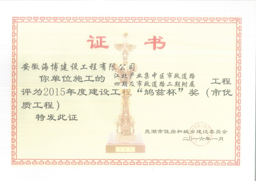 近期,我公司承建的江北產(chǎn)業(yè)集中區(qū)市政道路四期及市政道路二期附屬皖江大道明渠工程,喜獲2015-2016年度安徽省建設(shè)工程“黃山杯”榮譽。該工程位于蕪湖市鳩江區(qū)江北產(chǎn)業(yè)集中區(qū)起步區(qū)內(nèi),路線全長約9.4km,呈“井”字形布局,路面寬度24~32m,設(shè)計車速40km/h,新建瀝青混凝土路面,工程總造價約1.47億元。2014年3月,榮獲江北產(chǎn)業(yè)集中區(qū)“安全生產(chǎn)工作先進單位”稱號。2016年1月,獲得2015年度蕪湖市建設(shè)工程“鳩茲杯”獎,全面實現(xiàn)了工程質(zhì)量目標。