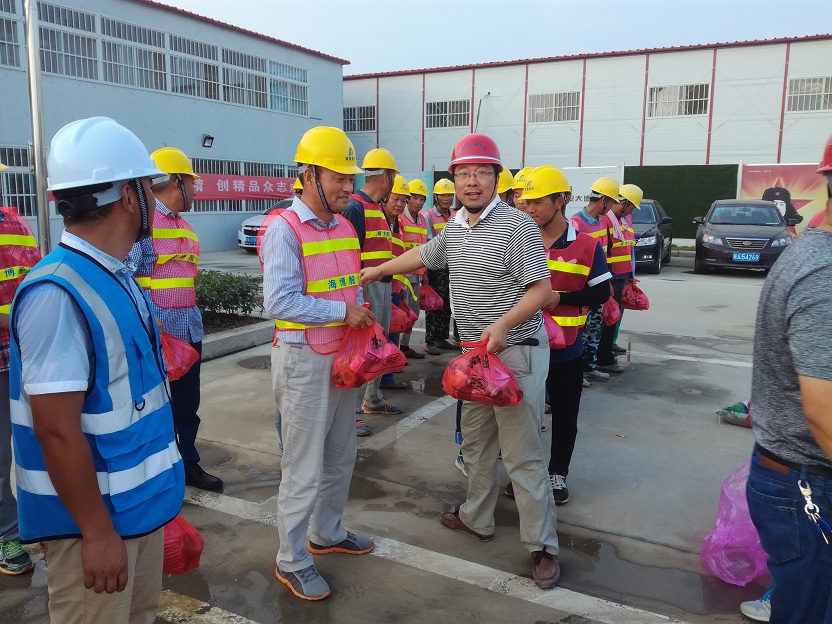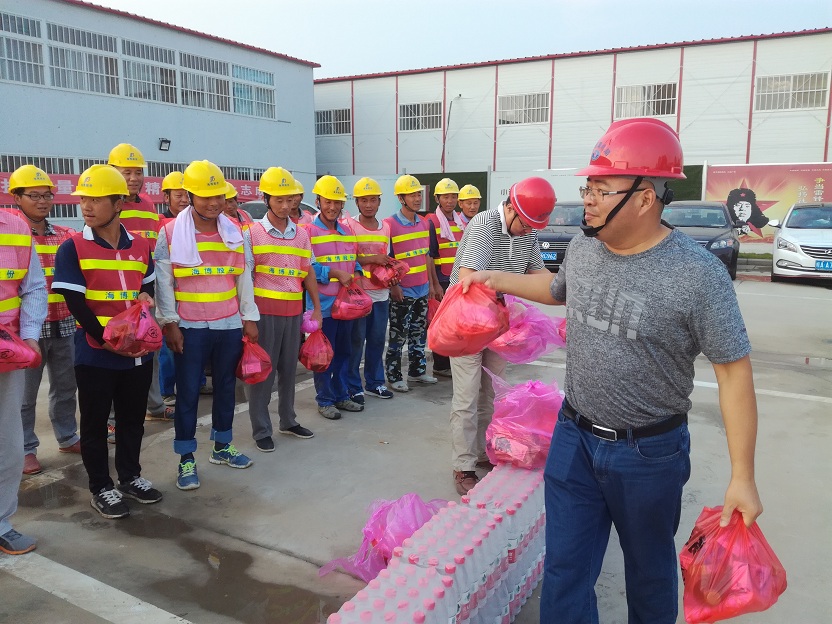 盛夏時節(jié),連續(xù)多日40度的高溫炙烤著合肥大地。7月28日,合肥市經(jīng)開區(qū)重點(diǎn)局張局長、董處長和海納項(xiàng)目辦何主任冒著酷暑,來到我公司海納新能源項(xiàng)目,給項(xiàng)目部送來了防暑降溫物資并逐一發(fā)放到工人手中。張局長對頂著烈日奮戰(zhàn)在一線的全體施工人員給予高度的贊賞和關(guān)心。投資運(yùn)營中心周總和部分管理人員、現(xiàn)場監(jiān)理、工人代表,參加了慰問儀式。周總代表項(xiàng)目部對重點(diǎn)局領(lǐng)導(dǎo)表示感謝,要求全體員工鼓足干勁,精心組織精心施工,不辜負(fù)各級領(lǐng)導(dǎo)的關(guān)懷和期待。