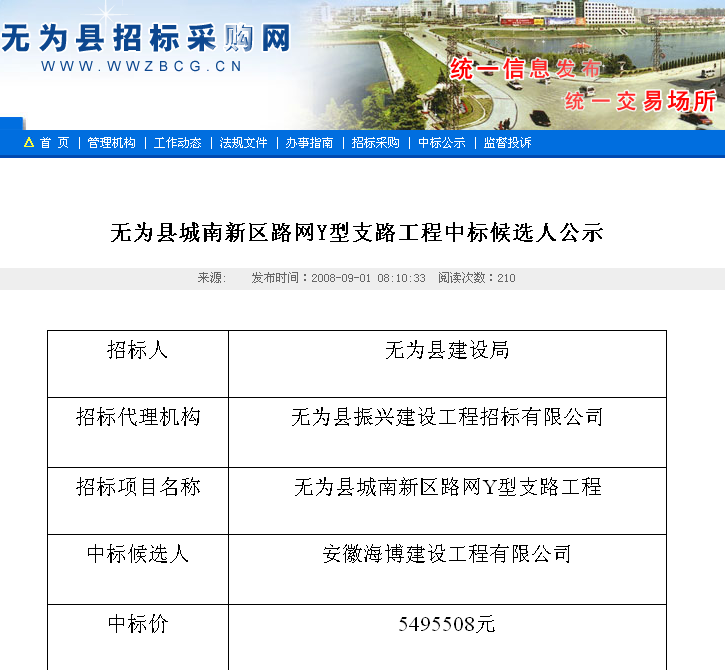 無為縣城南新區(qū)路網(wǎng)Y型支路中標(biāo)